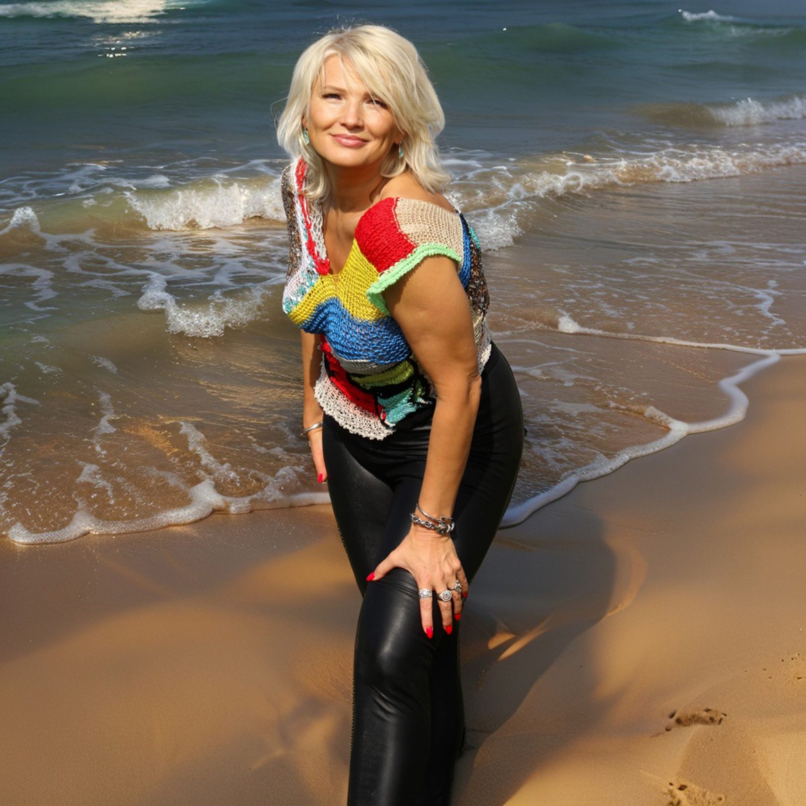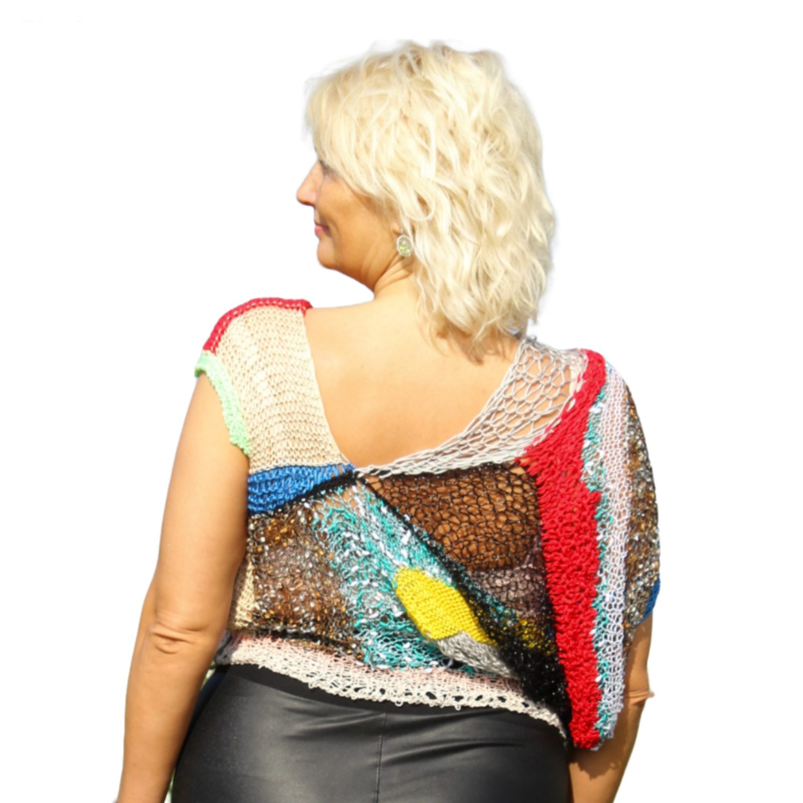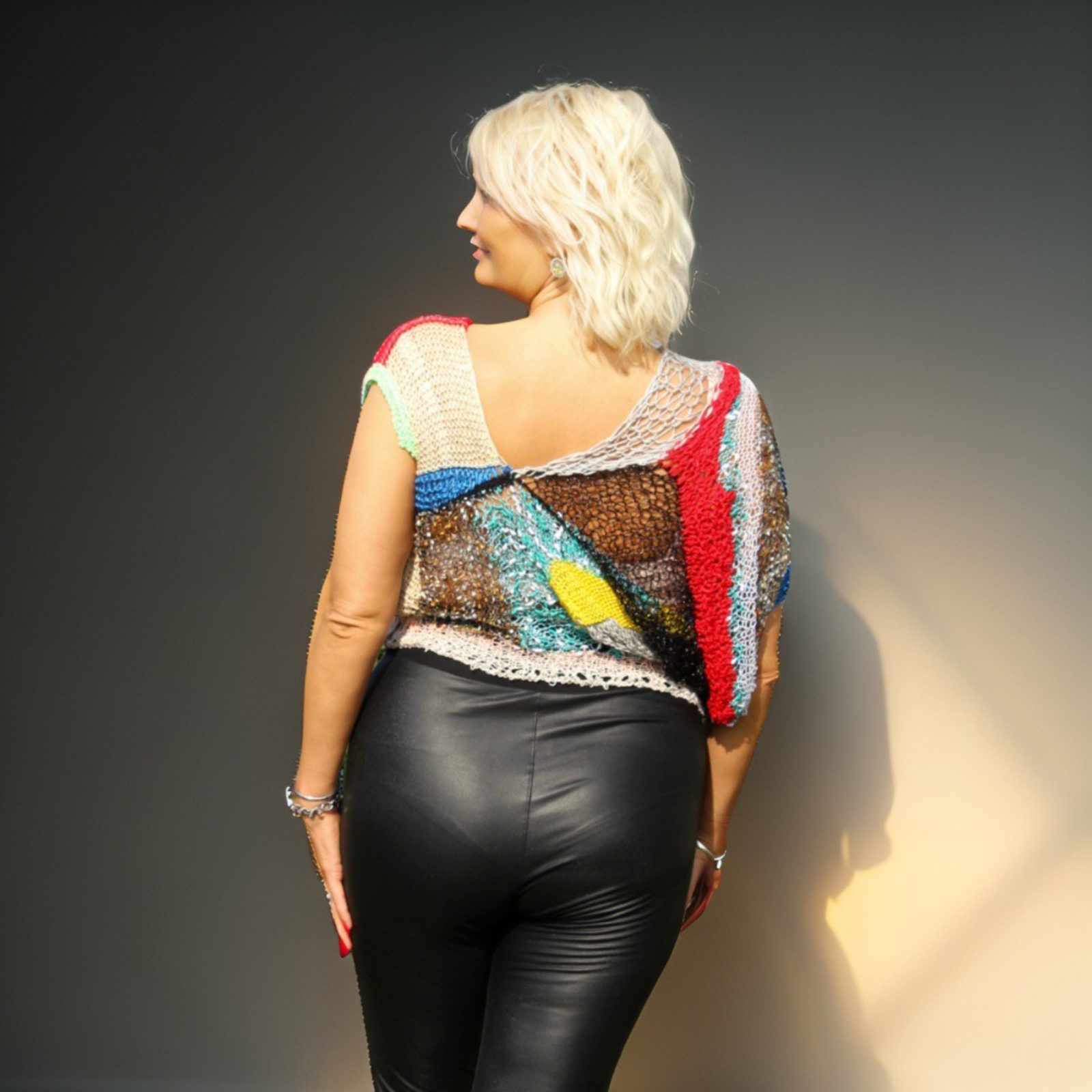 Colour Clash appears at exactly that moment. Defiance, knitted by hand. Red interrupts, yellow dazzles, blue issues commands, black draws a line under everything that only yesterday was considered proper. The colours are busy here: dividing territory and carrying on with provocative confidence. The wide openwork sleeve looks very much like a society scandal first whispered about by the wall and later retold with unmistakable pleasure.