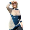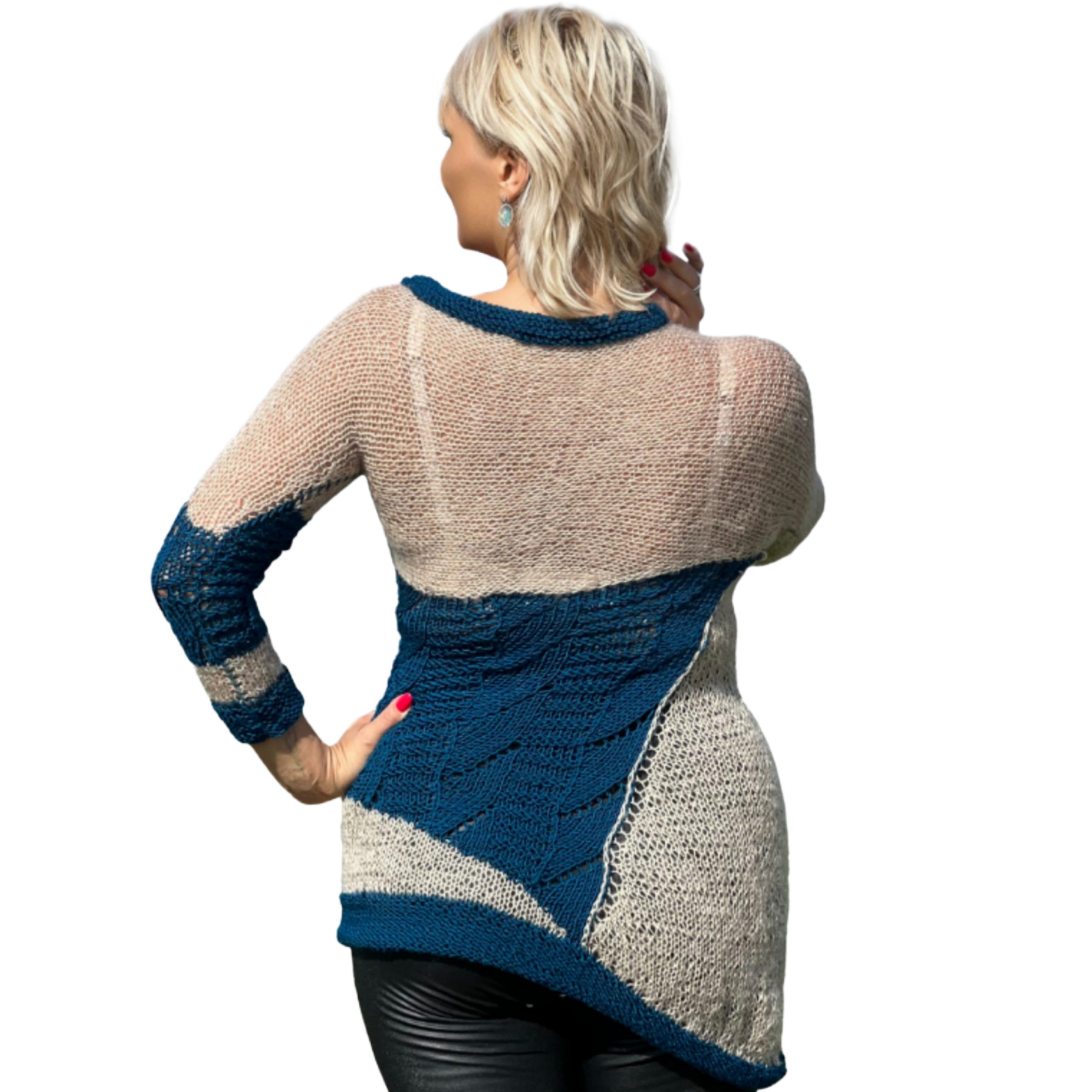 Ghostly Waves is built on exactly that. Fine sandy mohair nearly disappears on the skin, leaving only a hint, a breath, a half-tone. The openwork contrast – blue in one light, emerald in another – moves across the silhouette asymmetrically, in fragments, with that beautiful inconsistency which always looks more expensive than anything obvious.