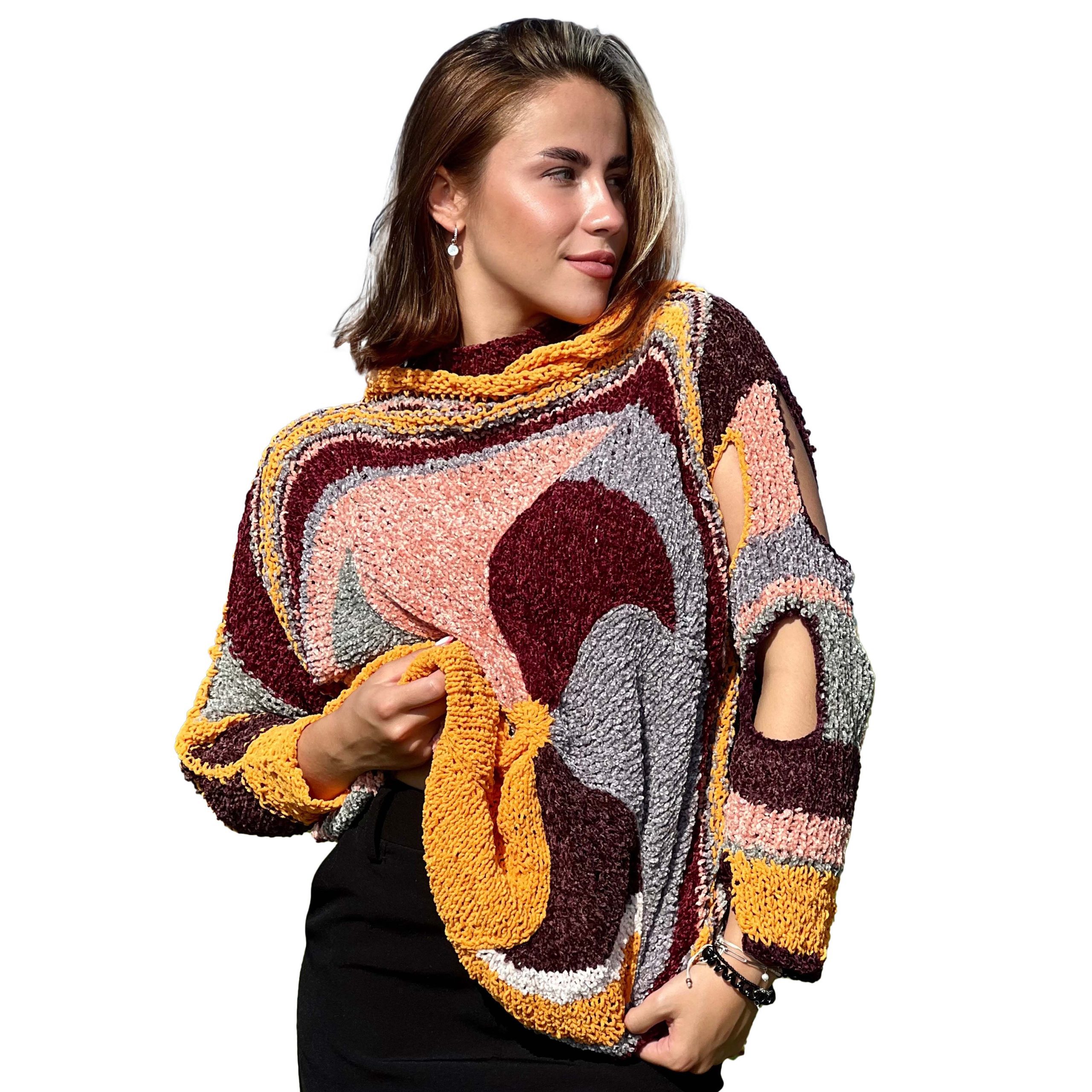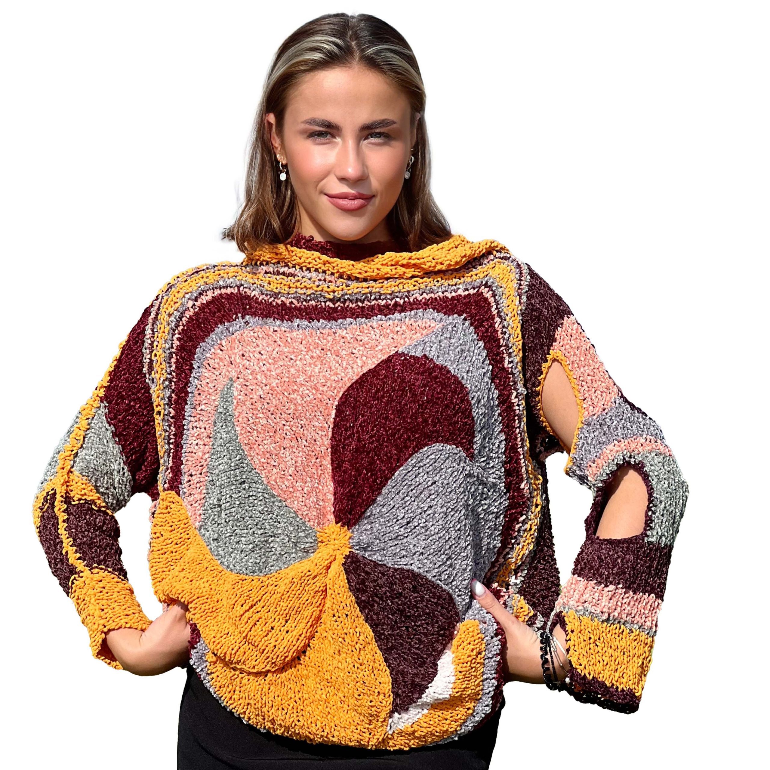 Plush Enigma — a bold handmade women’s sweater, where stripes and spirals whisper sophistication and audacity in every twist