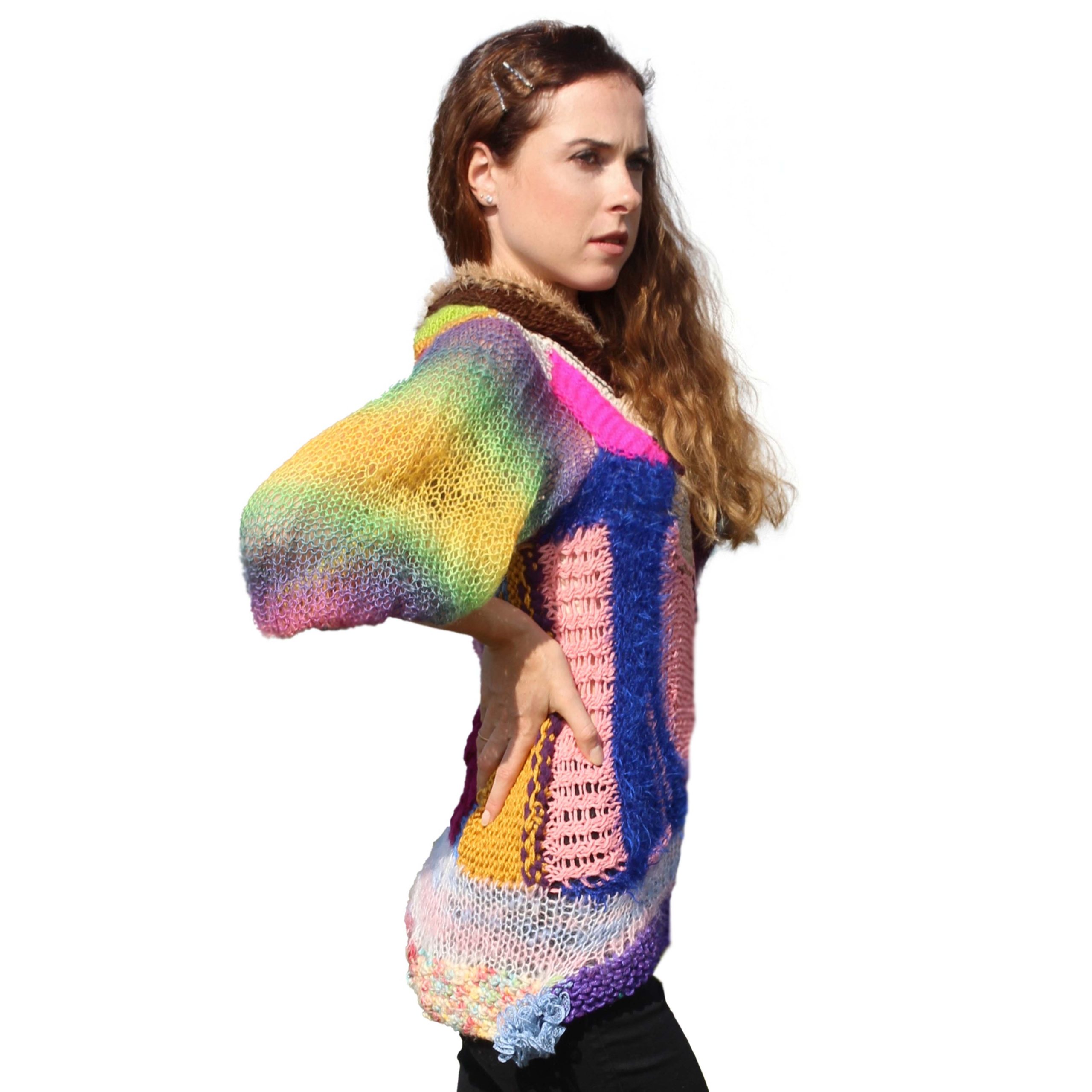 В Цветном Безумии живёшь иначе — шаги становятся увереннее, взгляд дерзче, голос громче, потому что когда на тебе вся палитра разом, мир перестаёт диктовать правила, и ты больше не статистка в чужом мире, ты художница, которая решила превратить себя в холст, и пусть смотрят, если осмелятся. Свитер Цветное Безумие — приталенный силуэт с неровным краем, где мохер, шерсть, акрил, хлопок и люрекс намешаны без правил, переверни его — и цветные пятна поменяются местами, более короткая часть окажется сзади, и выяснится, что у свитера нет правильной стороны, есть только две версии безумия.